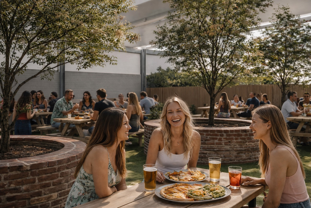 Featuring an exposed roof, hanging greenery, and views of the woodfired pizza oven, itʼs a light-filled space full of character.