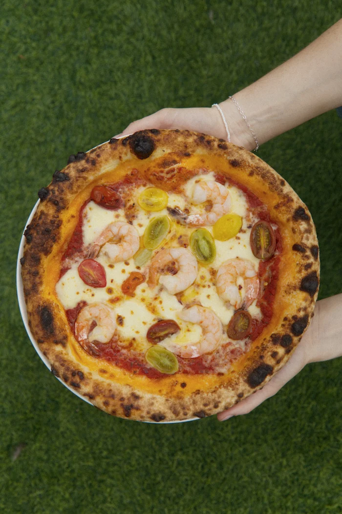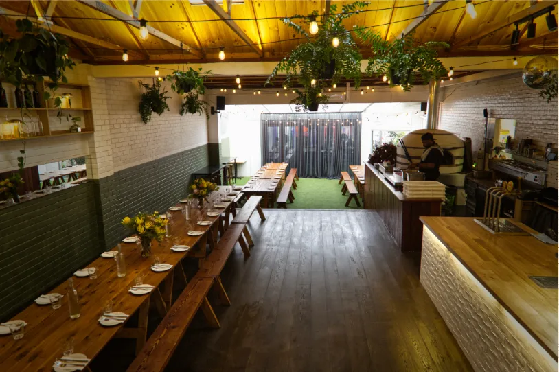 Featuring an exposed roof, hanging greenery, and views of the woodfired pizza oven, itʼs a light-filled space full of character – the perfect backdrop for celebrations of all kinds. The space also has a screen for photo projections.